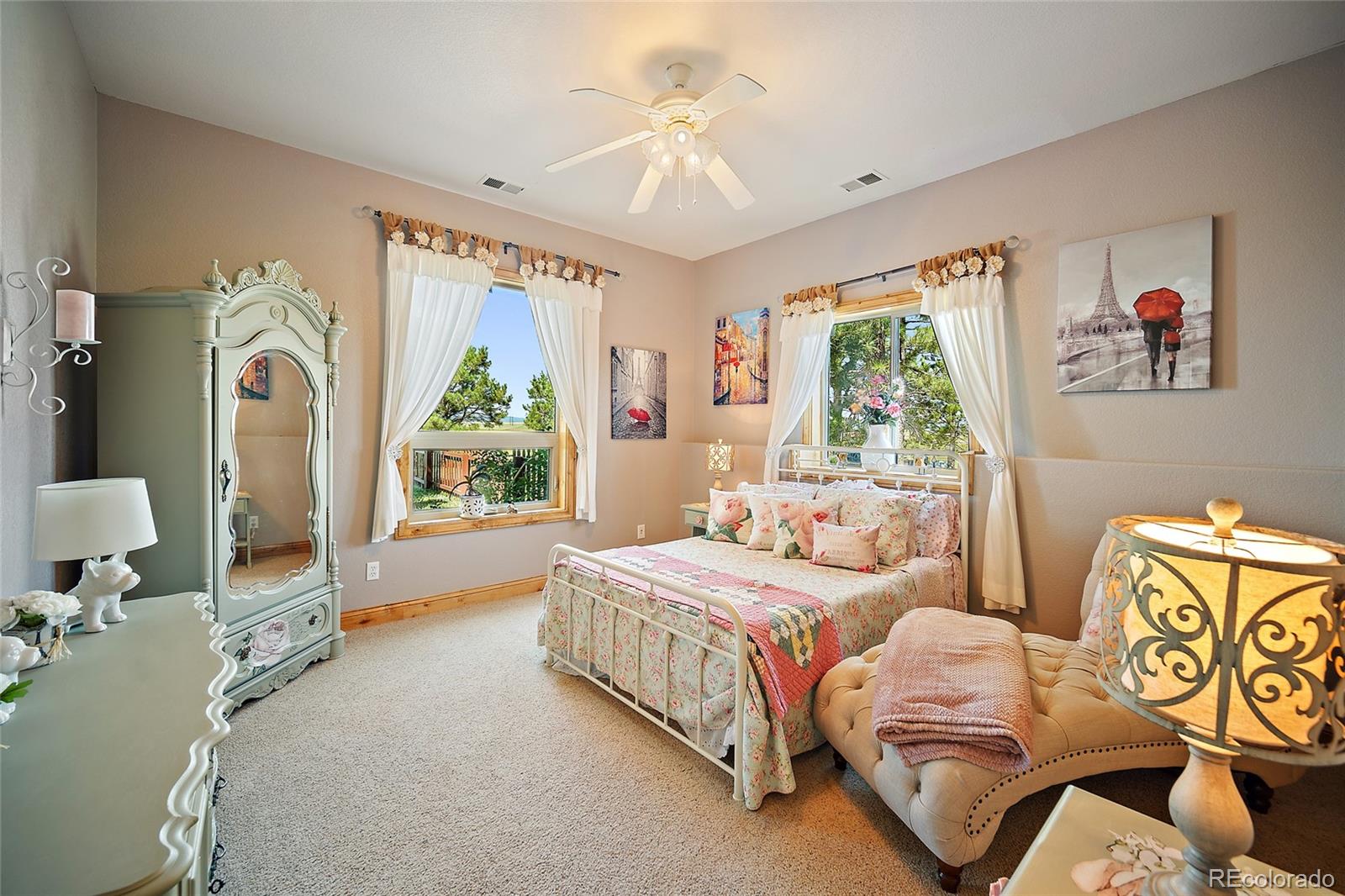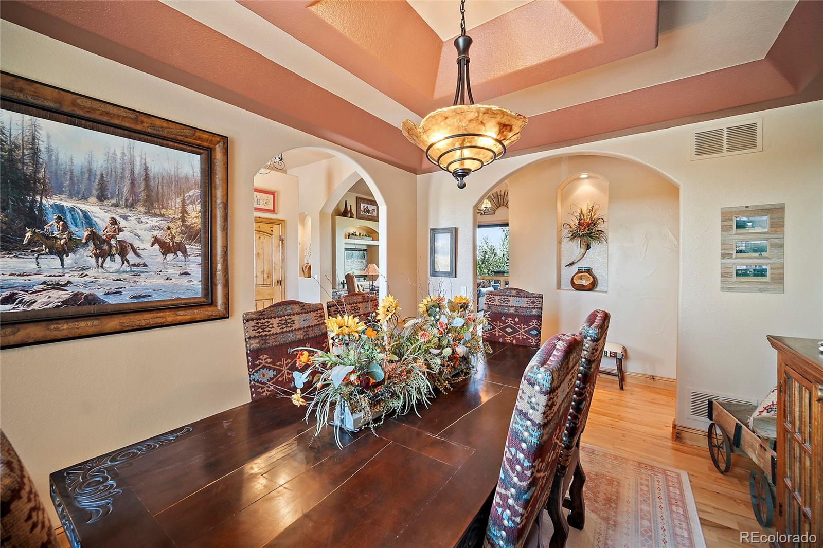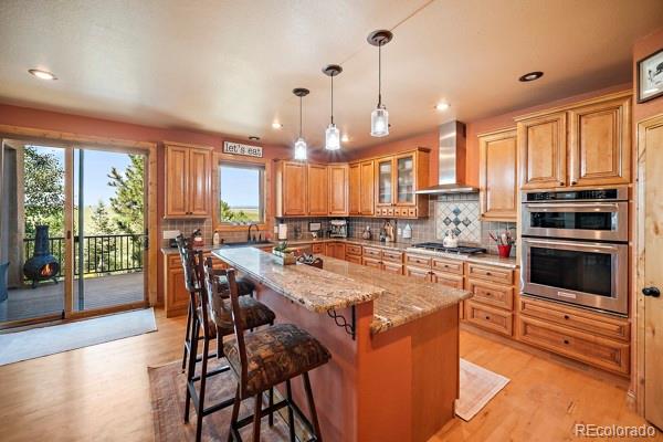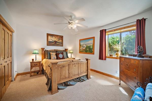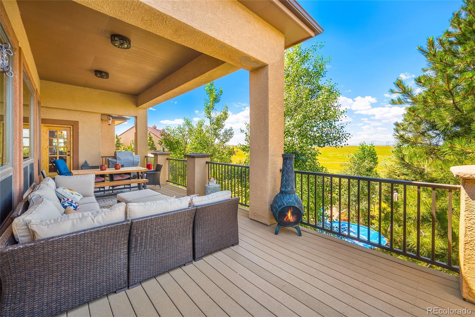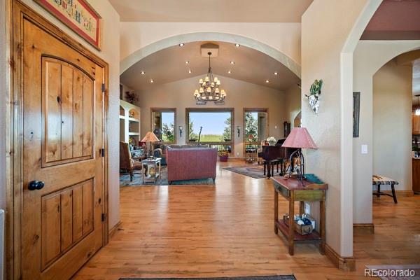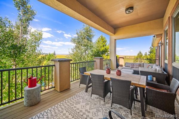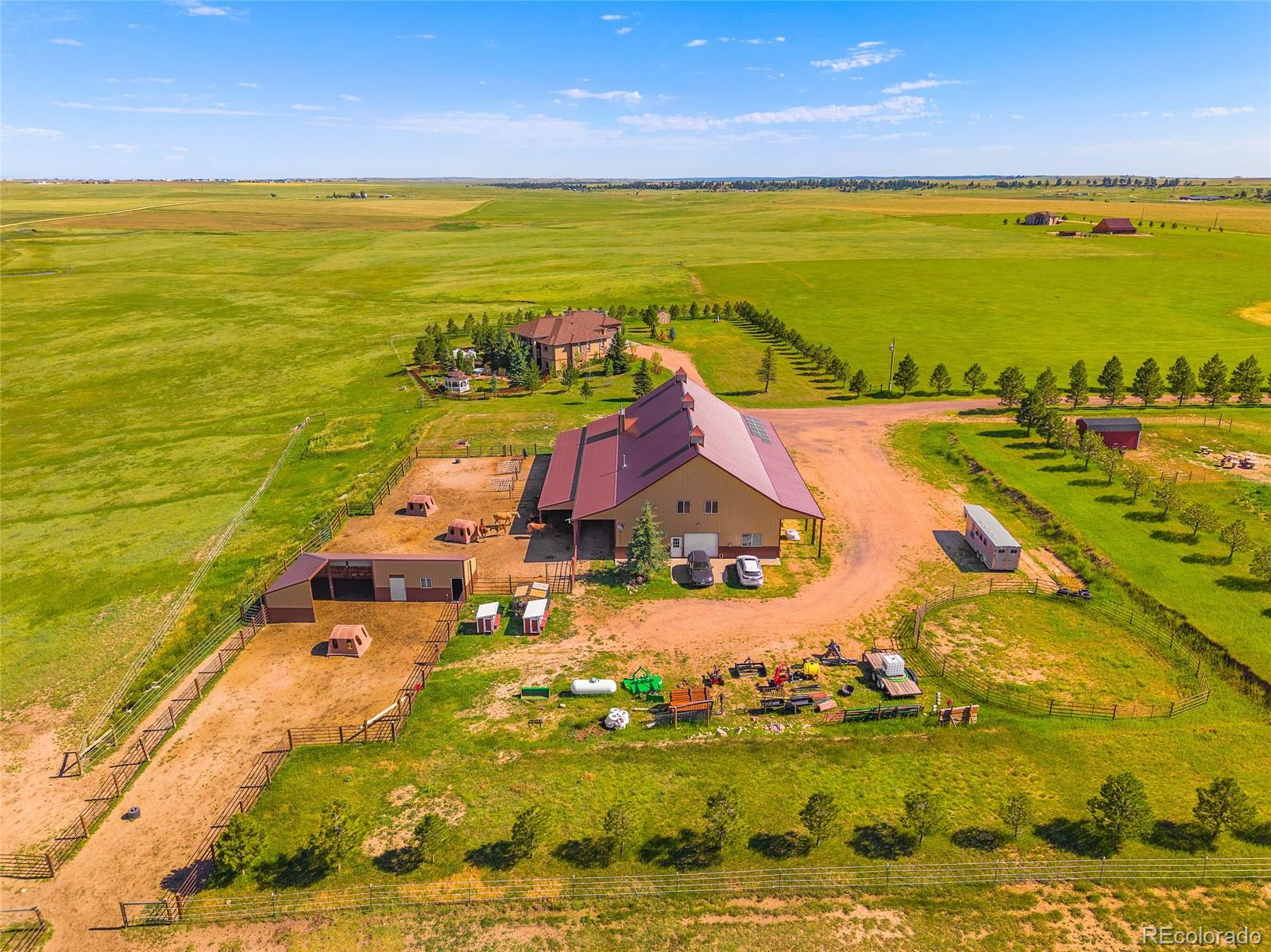 Looking for a peaceful Country Estate with front row views of some of Colorado's most majestic mountains? This property offers a rare blend of luxury and rural charm. NO hoa! Step into the heart of the home: a spectacular great room with soaring cathedral ceilings, stone fireplace, and custom built-in shelving--all oriented to frame the stunning mountain views beyond. Bathed in natural light from oversized windows, this inviting space is ideal for both quiet evenings and lively gatherings, combining rustic elegance with everyday comfort.The home's bright an open floor plan flows seamlessly from the great room into the gourmet kitchen, which features granite countertops, stainless steel appliances, a gas cooktop, spacious walk-in pantry, eat-in bar, built-in desk, and thoughtful custom finishes throughout. The formal dining room area features trey ceilings and wood flooring. The main-floor primary master suite is a serene sanctuary, showcasing a cozy fireplace, spa-inspired 5-piece en-suite with jetted soaking tub, walk-in shower, dual vanities, and private deck access--perfect for enjoying the panoramic views in peace. The fully finished walk-out basement offers a spacious great room area with stone fireplace & built-in shelves that opens onto the covered patio and landscaped backyard, a wet bar for entertaining, 3 additional bedrooms, 2 full bathrooms, and a home office/craft room. Outbuildings on this property are thoughtfully designed to support both equestrians and the project person who appreciates a large area in which to work. The Barn/Shop includes a large shop area, multiple stalls - some with turn-out pens, a large loft space ready to be transformed (tack room, office, studio, or additional storage--whatever your vision demands), and a full living quarters. Enjoy the freedom this Colorado Dream Property offers!